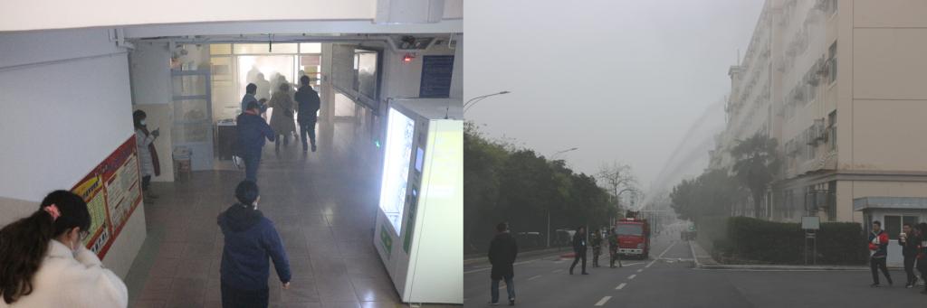 然后,辅导员将员工分别带到韵苑14栋和15栋指定地点,随后韵苑员工公寓14栋3楼东北侧窗口和15栋3楼西北侧窗释放烟雾弹模拟起火,烟雾弥漫14栋、15栋整栋楼,警报响起,在总指挥和现场工作人员指导下区域内人员有序向安全通道、出口进行疏散,到达安全地带。紧接着公司消防车迅速赶到现场,启用消火栓进行快速灭火,火势立刻被扑灭。