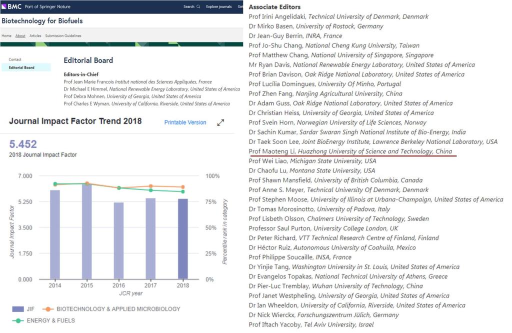 《Biotechnology for Biofuels》是英国BMC出版社旗下关注生物能源领域的国际权威期刊之一,该期刊最新影响因子为5.452,在Biochemistry, Genetics and Molecular Biology(前8%),Energy(前7%),Environmental Science(前3%)和Immunology and Microbiology(前8%)领域均属于Q1期刊,在中国科公司SCI期刊分区中也处于工程技术类1区。该杂志自出版发行以来,主要收录与生物能源、生物化学药品和其他生物产品生产中的最新技术和操作研究论文,重点关注于利用生物技术应用和协同操作来进行植物改良和通过生物转化体系来生产生物产品。同时,也关注生物质能、生物质能中间体或二氧化碳等原料及其上下游作业的研究。此次,栗茂腾教授受邀担任Biotechnology for Biofuels期刊副主编,标志着公司在生物技术及其应用领域的研究在国际上受到广泛关注并产生影响。