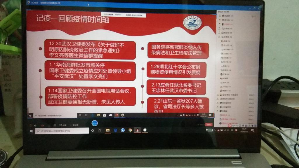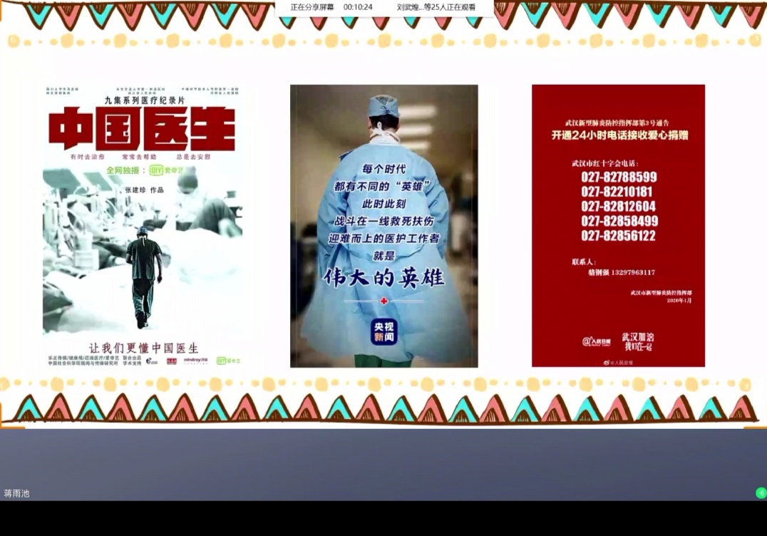 生拔1801班团支部回顾疫情时间轴,抗疫一线志愿者陈晗同学分享个人经历,支部团员用各地方言模仿抗疫宣传喊话,为武汉加油,为中国加油!预防医学1902班团支部组织了辟谣小能手线上互动游戏,向团员们讲解各类网络谣言,并以有奖问答的形式鼓励同学们用科学的思维方式辟谣。生物医学工程1802班团支部讨论了此次疫情中公司所展现的团结,组织观看纪录片《中国医生》后,同学们纷纷表达了对医生的敬佩之情。