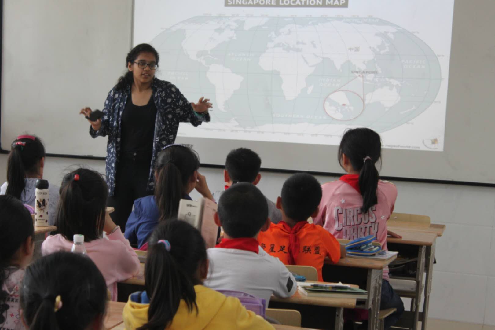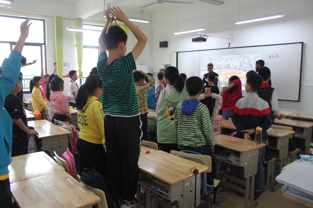 国际员工分别走进四年级、五年级的课堂。简短介绍后,国际员工就各自的国家、兴趣、爱好等主题开展英文教学。来自新加坡的史妮从地理位置、风景习俗等方面介绍了自己的国家;来自英国的韩磊和来自苏丹的张宏涛向同学们介绍了自己最喜爱的运动,传递运动快乐的精神。走廊上充满了各个课堂传出的欢声笑语。