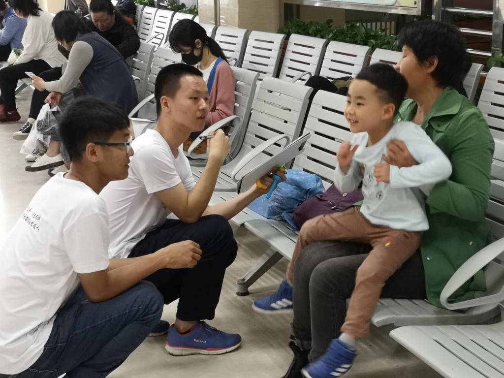 然而,与陌生人沟通并不容易。来到儿科候诊室、输液室,里面充斥着孩子的吵闹声、家长急切的脚步声、各种各样的讨论声。志愿者们的到来并未引起孩子家长的注意,任务过程中也磕磕绊绊。有同学羞于和陌生人沟通;有同学则遇到小孩过分依赖家长不愿和自己接触;有同学在面对孩子哭闹时,不知所措等。但是,当志愿者们大胆地表明自己志愿服务的意图,用可爱的玩具逗乐生病孩子时,与家长们的沟通也变得相对容易了。