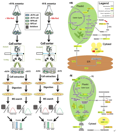 其次,利用单细胞分选技术和高通量蛋白组技术,研究团队探究了培养过程中微拟球藻Nannochloropsis oceanica细胞的油脂积累异质化问题。研究者利用了高通量流式细胞分选技术从缺氮处理和正常f/2培养基培养的微拟球藻细胞中分选得到不同实验处理条件下油脂积累量差异显著的亚群细胞。基于蛋白质组分析可以提供给研究者详细而全面的蛋白质表达情况,该研究中利用蛋白质组质谱分析得到了不同处理条件下,蛋白质表达上的差异,以及不同亚细胞群之间的蛋白质表达差异。通过对蛋白质表达差异与积油差异的关联性分析发现,正常f/2培养基和氮源极度缺乏的f/2培养基条件下出现积油差异的机制是不一致的。正常f/2培养条件下,高表达油脂的亚群会高表达油脂滴表面蛋白,同时也高表达丙酮糖磷酸二激酶。而在极度缺乏氮源的f/2培养条件下,针对高表达油脂细胞亚群,观察到光合作用有关蛋白质(光捕捉、叶绿素合成)表达的大幅下调,尤其是达尔文循环中有很多关键蛋白表达有所下调,比如磷酸戊酮糖差向异构酶和转酮醇酶。此外,油脂滴表面蛋白表达也有很大程度上的下调。