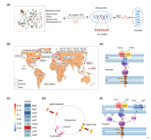 Shewanella is a genus of metal-reducing bacteria that can use a variety of metal compounds as the final electron acceptors of respiration under anaerobic conditions. Its ability to degrade metals plays a key role in bioremediation of toxic elements and heavy metals. To investigate the genetic diversity and clarify the evolutionary dynamics of genus Shewanella, Kang Ning's team conducted a pan-genome analysis for 24 Shewanella strains, with special focus on the evolution of metal reduction pathway. The analysis results indicate that: 1. The 24 Shewanella strains exhibited an open pan-genome structure and the core genes were constant evolving by purifying selection. 2. The high proportion (43.3%) of unique genes emphasized the heterogeneity of the genus and the important role of the variable genome in individual strains. 3. Abundant gene gain and loss contributed to functional change of Shewanella, in which the loss-of-function plays an important role in the vertical transmission. Especially, for the metal reducing pathway of genus Shewanella, the mtr-omc gene cluster evolved under strong selective constraints, with the existence of gene gain and loss, indicating a possibly metal respiratory specialization.