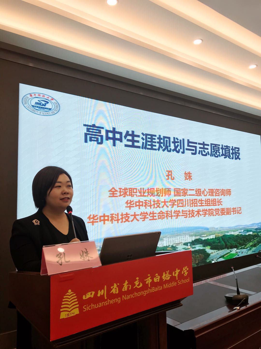 同时,公司积极展示学科特色与公司风采,3天赴3个城市,在南充高中、白塔中学以及阆中中学成功举办9场报告会,受众师生和家长超过5000人,参与活动的员工及家长对各场报告会反响热烈,争相提问并积极争取交流机会。常务副经理杨祥良为低年级员工做科普讲座,通过生动活泼的讲解带员工认识《有趣的纳米世界和神奇的纳米医药》;苏莉教授从好莱坞大片谈起,向员工介绍生物技术相关知识,做《从好莱坞大片谈生物技术》科普报告;罗亮教授结合社会热点以《药神?神药?-新药的诞生之路》为主题带领高中生领略新型抗肿瘤纳米药物的研发;党委副书记孔姝针对中学师生家长热切关注的志愿填报事宜,做《高中生职业生涯规划与志愿填报》专题报告。