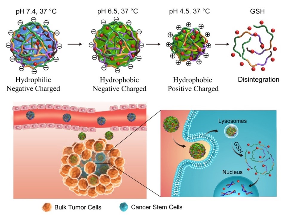 对于目前的抗肿瘤纳米药物来说,如何实现体内长循环、肿瘤部位高效富集及深部穿透、被肿瘤细胞和肿瘤干细胞有效摄取及可控释药仍然是其面临的主要挑战。纳米特征,如粒径、电位、亲疏水性等深刻影响纳米药物的体内过程。本研究通过构建一种基于聚(N-异丙基丙烯酰胺)的温敏纳米凝胶,发展了一种非PEG化亲疏水性反转策略。这种纳米凝胶在血液循环过程中具有亲水性,可以延长其血液循环时间;一旦它们聚集在肿瘤部位,就会对肿瘤组织的酸性微环境迅速响应而反转成疏水性,这种自适应疏水性有利于其在肿瘤部位的富集、肿瘤深部穿透及被肿瘤细胞和肿瘤干细胞高效摄取;结合溶酶体pH调节的电荷反转和对胞内氧化还原响应的药物释放能力,此纳米凝胶可以从溶酶体中逃逸并释放负载的化疗药物阿霉素。因此,该纳米凝胶载药系统具有良好的抗肿瘤及杀伤肿瘤干细胞的能力,并减少了阿霉素的毒副作用。这一研究为设计更加安全有效的抗肿瘤药物递送系统提供了新思路。