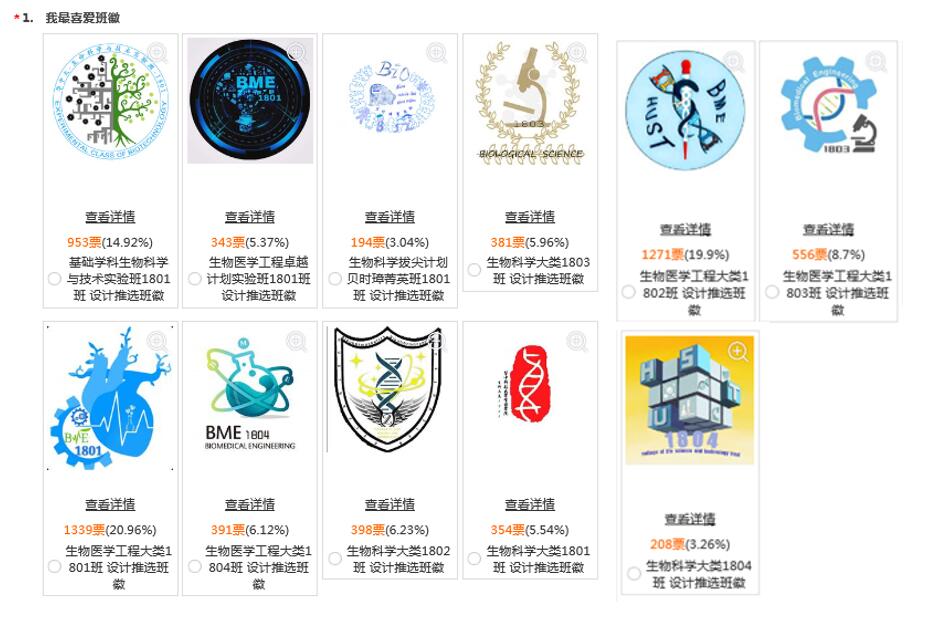 图1:2018级本科生在报到前开展的班徽设计大赛上设计的作品及票选情况