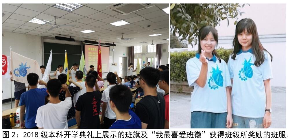 图2:2018级本科开学典礼上展示的班旗及“我最喜爱班徽”获得班级所奖励的班服