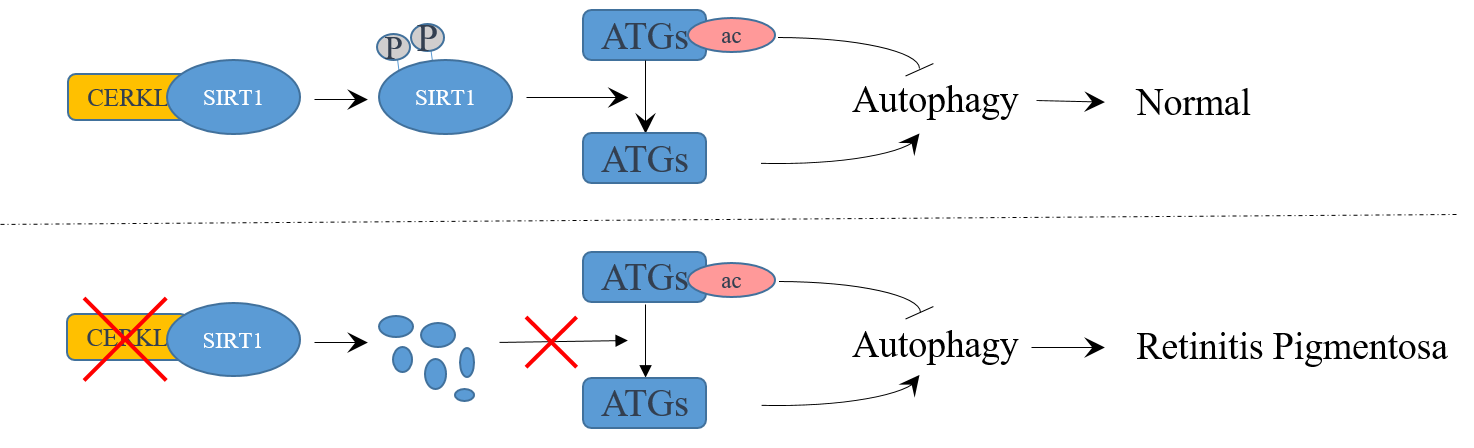 论文中,胡雪斌等进一步探讨CERKL在视网膜中的生理功能,他们发现CERKL敲除破坏了斑马鱼感光细胞和视网膜色素上皮细胞中的自噬功能。体内体外实验均表明CERKL缺失或表达抑制均可显著抑制细胞的自噬。该研究进一步发现,CERKL通过调控去乙酰化酶SIRT1维持视网膜细胞自噬的自噬功能。在视网膜色素上皮中,CERKL直接与SIRT1相互作用,调节SIRT1的磷酸化来调节SIRT1的蛋白稳定性和酶活性进而影响ATG蛋白的去乙酰化,从而维持视网膜细胞的自噬功能。全文揭示并阐释了CERKL通过SIRT1调节自噬,维持视网膜内稳态的分子机制。