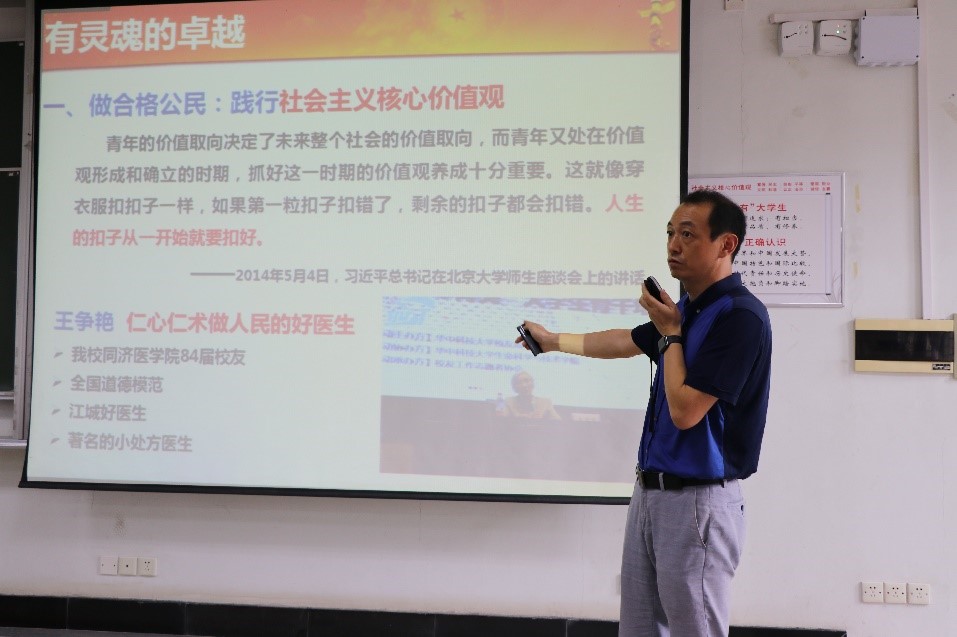 张涛书记首先以近期新闻热点事件“高铁霸座”为引子,抛出两个问题:大学要培养什么样的人?同学们要成长为什么样的人?启发大家思考,告诫同学们做人做事做学问首先要崇德修身。随后张涛书记从“有灵魂的卓越”、“肩负时代重任”、“争做时代先锋”三个方面展开讲述。通过阐述社会主义核心价值观和六有老员工的内涵,引导同学们要在做合格公民的基础上,努力做有灵魂的卓越华中大人。接着向同学们宣讲党的十九大精神,并着重介绍改革开放四十年和砥砺奋进的五年中国所取得的巨大成就,以及公司、公司的发展情况,告诉同学们肩负着实现中国梦的时代重任。然后以胡吉伟、员工黄群和崔崑院士等为例,深入浅出地向同学们阐述了党员先锋模范的内涵,并号召同学们早日站在党旗下,争做时代先锋。