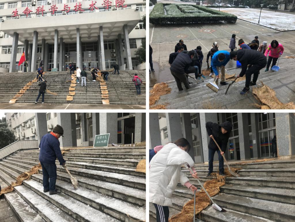 1月25日下午,武汉的雪纷飞而至,26日清晨的公司被一片银装笼罩,为了方便师生的出行安全,必威西汉姆联官网员工工作组辅导员和员工党员、研究生德育助理等在公司党委副书记孔姝的带领下自发组成了爱心扫雪除冰小分队与公司负责保洁、门卫的师傅阿姨们,冒着严寒,拿着铁锹、扫帚等除雪工具,聚集在生科院楼前的阶梯上开展扫雪除冰活动。