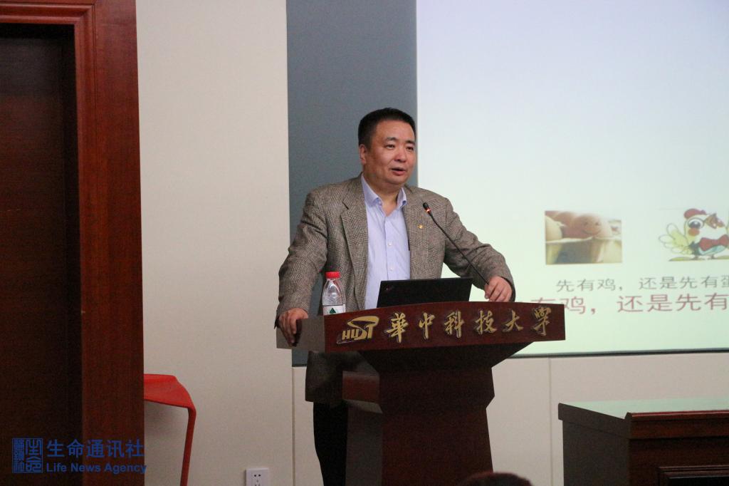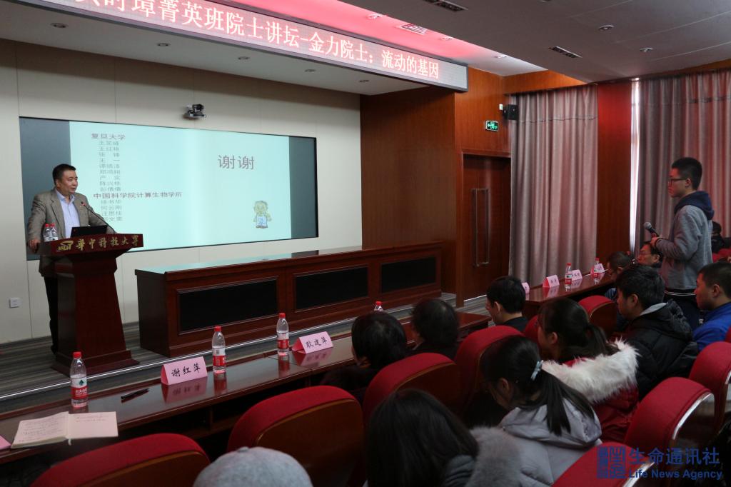 金力院士结合自己在人类遗传和人群起源迁徙等方面的科研工作,为同学们讲述了这些科研工作中十分有趣的细节和值得分享的故事。他从追问几个为什么开始,以“流动的基因”为主题进行了多方面的探讨。他提出,为什么我们黄种人成为了黄种人,是什么决定了我们的肤色,引起大家对人类进化的思考。紧接着,他以经典问题“是先有鸡还是先有蛋”生动形象地阐释了生殖细胞突变对物种进化的重要意义。金力院士幽默生动的讲述赢得了同学们阵阵掌声,让同学们在欢乐的氛围中对生物进化有了更深刻的认识,燃起了对生命科学科研工作的极大热情。