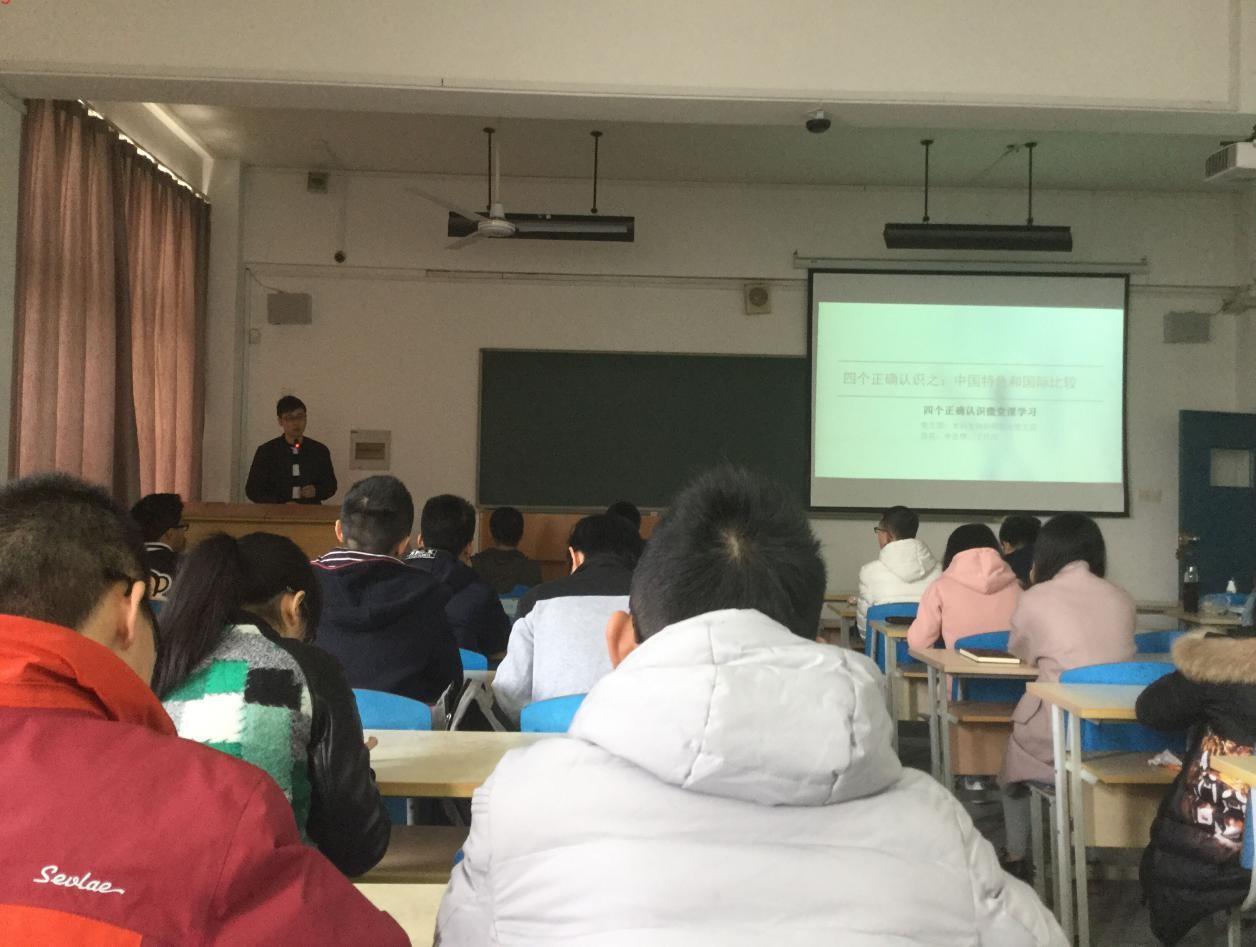 支部党员分为四个小组,推选四位主讲人围绕“四个正确认识”讲述微党课。杨靖同志以“正确认识世界和中国发展大势”为主题,从世界概况、中国面临的问题和取得的成就三部分进行分析,引导大家了解目前的世界格局,认识中国的发展现状。随后高俊军同志引入第二个“正确认识”,即“正确认识中国特色和国际比较”。从经济、政治、社会、发展理念、国际关系等几方面着手,梳理改革开放以来中国所取得的巨大成就,以及中外在经济、政治、文化等方面的比较,引导同学们客观认识当代中国、理性看待外部世界。