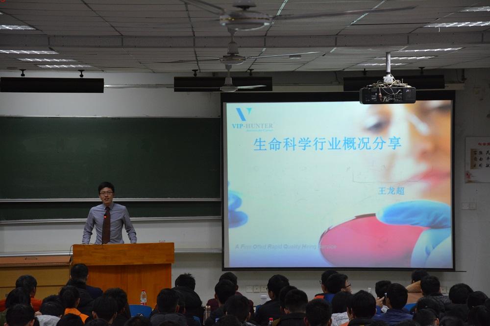 2月24日晚,必威西汉姆联官网2017年生命科学行业分享与座谈会在东十二楼举办。会议邀请生命行业猎头公司VIP-HUNTER的王龙超经理和必威西汉姆联官网黄超老师担任主讲嘉宾,分别就生命行业的就业市场整体情况和公司科研团队基本情况进行讲授,讲座结束后又通过访谈形式进行分享。