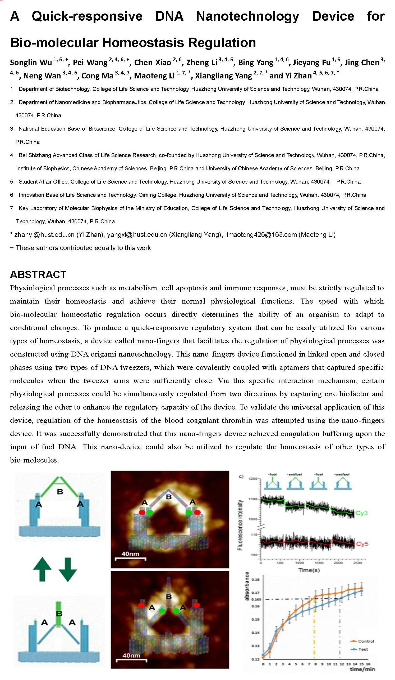 北京时间7月12日晚,必威西汉姆联官网本科生国际竞赛团队BIOMOD HUST-China迎来好消息:团队论文A Quick-responsive DNA Nanotechnology Device for Bio-molecular Homeostasis Regulation被Nature出版集团下属的期刊Scientific Reports(影响因子5.228)接收。2015年该本科生团队自主设计提出“调控生物因子平衡的DNA纳米装置”概念,并组队参加在哈佛大学举办的BIOMOD国际生物分子设计大赛,一举夺得金奖和总分第三名的好成绩。回国之后,团队成员经过对参赛项目的进一步论证和深入研究,结合“DNA折纸术”这一先进的纳米技术手段,应用原子力显微镜成功解析了新设计的分子装置的准确结构,并通过凝胶电泳、荧光共振能量转移和凝血酶原时间测试等各类实验方法成功验证该装置快速响应调控生物因子平衡的各项功能,最终整理成全本科生作为作者的研究论文并获得国际权威期刊发表。