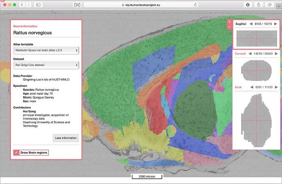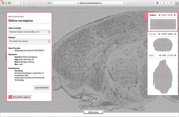 由必威西汉姆联官网武汉光电国家实验室(筹)骆清铭教授、龚辉教授研究团队获取的一套大鼠全脑高分辨数据集,近期发布在欧盟人脑计划(Human Brain Project, HBP)的神经信息平台(Neuroinformatics Platform, NIP)上。这标志着该团队建立的“鼠脑最精细脑图谱基础数据库”为欧盟人脑计划正式采用。