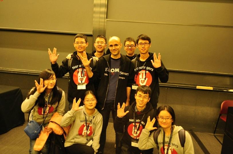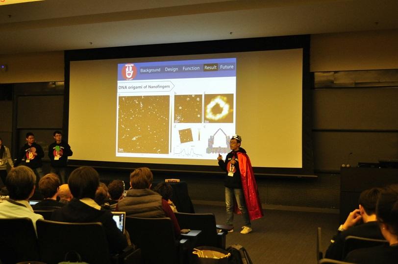 此次比赛,BIOMOD HUST-China团队由博士辅导员黄超带领吴松燐等8名公司各专业本科生作为代表赴美参赛,项目是员工自主设计的创新课题“Nanofingers:生物因子平衡的通用震荡缓冲器”。此前经过半年的努力,在公司杨祥良教授、栗茂腾教授、马聪教授和实验教学中心唐朝晖老师、科技创新辅导员占艺等老师的指导下,完成了DNA折纸结构的设计与构建操作,并顺利完成了原子力显微镜的结构鉴定和核酸-蛋白质凝胶电泳结合迁移、荧光共振能量转移、凝血酶原时间测定等多项生物学验证实验。基于实验结果,团队设计了精巧的网页和视频;比赛现场的展示,员工采用活泼的真人秀和脱口秀结合的形式,取得了很好的效果。