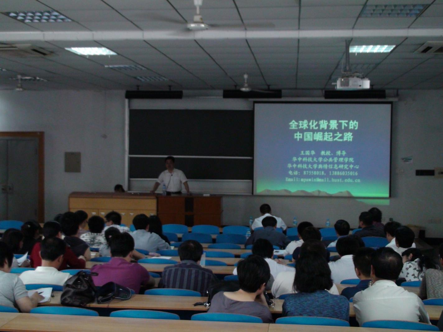 王国华教授以“全球化背景下的中国崛起之路”为主题,围绕中国崛起的进程、面临的机遇和挑战、以及崛起过程中要注意的问题三个方面进行了精彩阐述。王教授用丰富的史实带着大家回顾了近500年来世界的大国兴衰,用有力的数据向大家展示了中国跨越式的发展,并和大家一起展望了中国崛起的美好未来。王教授专业的理论知识和生动的时事实例为全体师生清晰并有层次地展示了中国在全球化背景下崛起的道路。