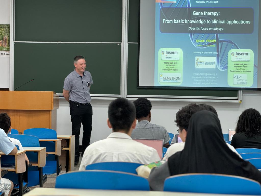 埃夫里-巴黎萨克雷大学的Sylvain Fisson教授的讲座主题为“眼部疾病的基因治疗及临床应用”,一进入教室,Sylvain教授就用中文和大家打招呼,收获了同学们的热情回应。讲座中,Sylvain教授从基因治疗的基本概念出发,介绍所研究过的经典病例,结合风趣幽默的课堂互动,使同学们对基因治疗技术有了更好的理解。课程最后,Sylvain和同学们探讨了关于基因编辑与基因治疗的伦理问题,增强了大家的科学责任感。