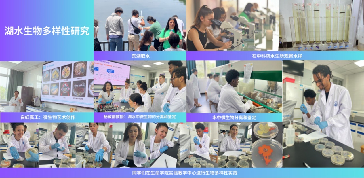 生物多样性是人类生存和发展的基础,也是本次学习的重要主题。在中科院水生所周巧红研究员团队的带领下,同学们在碧波荡漾的东湖之滨采集水样,并在水生所实验室对所采集养本进行观察;在白虹高工和杨敏副教授的指导下,分离和鉴定湖水中的微生物,并在超净工作间开展涂布及微生物绘画实验。同学们灵感无限,以培养皿为画布开展创作,对生物多样性的理解在采集-观察-创作的沉浸式学习中深化。