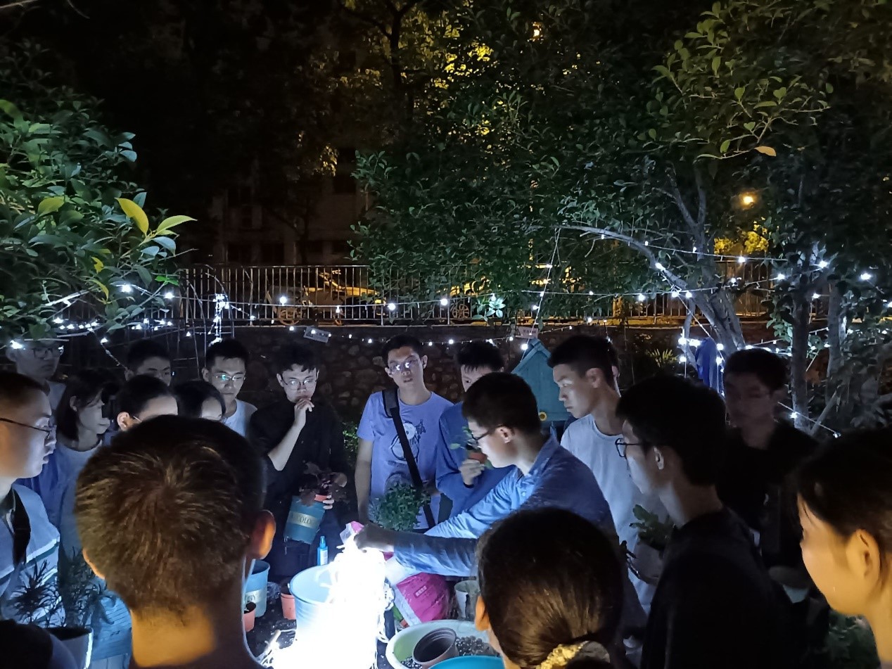 晚饭后,披着一身夜色,来到了咱的生命小农园。自马路上下望,恰似倒映在地上的小片星海。步入小农园,漫步于线灯照映着的石板路,嗅着泥土踏实的气味,我们也都有了轻松和亲近自然的感觉。所有人在选取多肉植物、迷迭香等盆栽后,听取了老师对此次务农工作的讲解。根据老师的指导,进行了填土,换盆,浇水的系列工作,即在培养自己的小盆栽前的移植工作。有的同学在开始的土用完后进行了营养土的混合搅拌工作,就像和了个面,也有所谓的手法可言。也有同学在附近的工具间里和华科的小动物——黄鼠狼碰了个照面。在此次农作活动之后,我们收获了自己要养的小盆栽,亲生体验了农学,也许和生物科学之美更近了一步。但愿这能激起各位日后学习生科的兴趣。