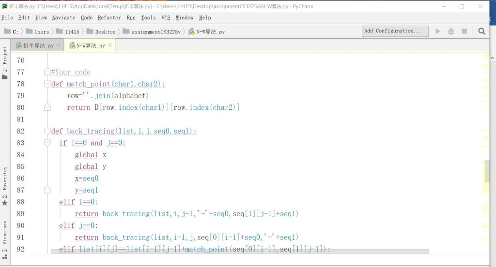 整个课程中印象最深刻的就是宋老师给我们布置的一项大的programming,用python编写全局序列比对算法。并且尽可能地减少时间复杂度和空间复杂度。最常见的,最简单的是N-W算法,然后更高难度的是mid-point算法。听起来容易做起来难,虽说对于整个算法的思想我们都掌握了,但是想要把文字转化为计算机语言并没有想象中简单。从苦思冥想到豁然开朗,从手起笔落到一直按着F7Debug,整整一天的时间都用来不断研究改进代码,对于这个算法又有了新的认识,对于动态规划有了新的体会。
