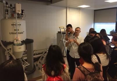 接下来我们在这位老师带领下参观了INSERM实验平台,其中令我印象最深的是核磁共振仪,它的原理是将物质置于特殊的磁场中,用无线电射频脉冲激发其内的氢原子核,引起氢原子核共振,并吸收能量。在停止射频脉冲后,氢原子核按特定频率发出射电信号,并将吸收的能量释放出来,被体外的接受器收录,经电子计算机处理即可获得图像,也就是核磁共振成像。之前只是在仪器分析书本中学习过,而在仪器旁亲身听老师讲解则加固了我对核磁共振的认知。此外,我们还参观了一个用来制造纳米级别钻石的化学纳米实验室。纳米钻石是只有用电子显微镜观察才能观察到的微小的颗粒,可用于向癌细胞传输化疗药物,且已有研究表明此类药物传输系统是更安全有效的,在未来有广泛的应用前景。