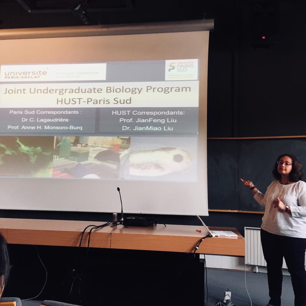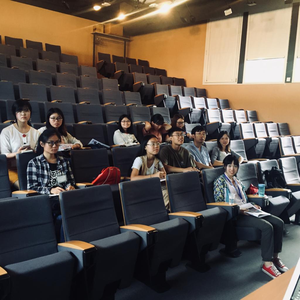 随后,是两位分别来自印度和葡萄牙的Satish Bodakuntla和Sofia Morgadinho Ferreira博士为我们简单介绍了自己的研究领域。第一位讲的是高谷氨酰胺化对于神经通路特别是轴突的运输功能的影响,其中令我们惊奇的是轴突中也存在运动蛋白,在午饭时一位同学向博士提出有关其能否传递刺激的疑问,与学者请教过后得知这是一个当下未知并且较难解决的问题,这也印证了神奇的生物世界有着无数新的问题等着我们去解决。第二位女博士的分享讲述了当下临床遇到的两个问题—效能与毒力,并且让我了解到了一种新的物质—Dbait,这是一种DNA修复抑制因子,可对辐射造成的DNA损伤的修复造成明显影响。或许因为他们与我们的年龄更相似,而且他们更加着重介绍了自己的人生经历,让我们产生了很大的共鸣。我们应该在不断尝试中找到自己真正喜欢的东西,并且坚持下去。最后,Pierre Sohier博士为我们作报告同时也是他们课题组的组会,因此有许多学者与我们共同聆听,主题为β-catenin信号分子在黑色素瘤中的作用。由于报告的内容过于专业,我们大多数人都只能听得一知半解,这也让我们意识到了我们作为大二大三的员工,在专业知识上的不足。