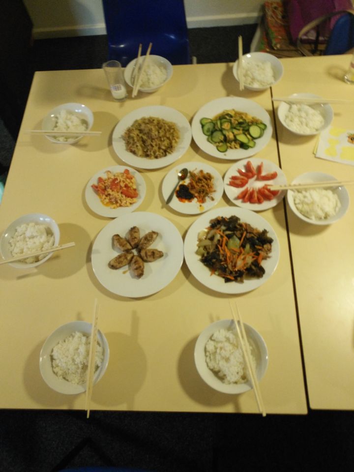 晚餐从6点多就开始准备起来了,我仗着自己以前在家炒过几次,过了一把颠勺的瘾,看见大群里面有人晒菜,大家士气顿时高涨了起来,炒菜的炒菜,焖饭的焖饭,摆盘的摆盘。
