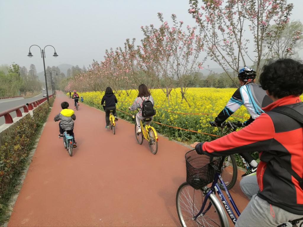 早晨9点整,公司一行二十余人在公司大楼前整队完毕,从东区侧门进入森林公园。队伍途经油菜花海、儿童乐园,一路春光灿烂,花香袭人。行进到青王公路花木城,队伍分成两路,带孩子的亲子骑队伍沿着森林公园二期绿道返回公司,骑行十余公里;另外一队继续前行,途经万国公园、白马驿站、桃花岛、九女墩,湖中道,环湖一圈回到公司,总行程约60公里。