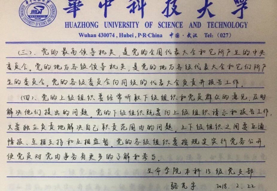 3月26日,​必威西汉姆联官网本科15级党支部历时两月有余的手抄党章活动落下帷幕。自1月24日以来,15级党支部成员每日不间断进行《中国共产党章程》全文的抄写学习活动,春节期间亦有党员同志在坚持学习。