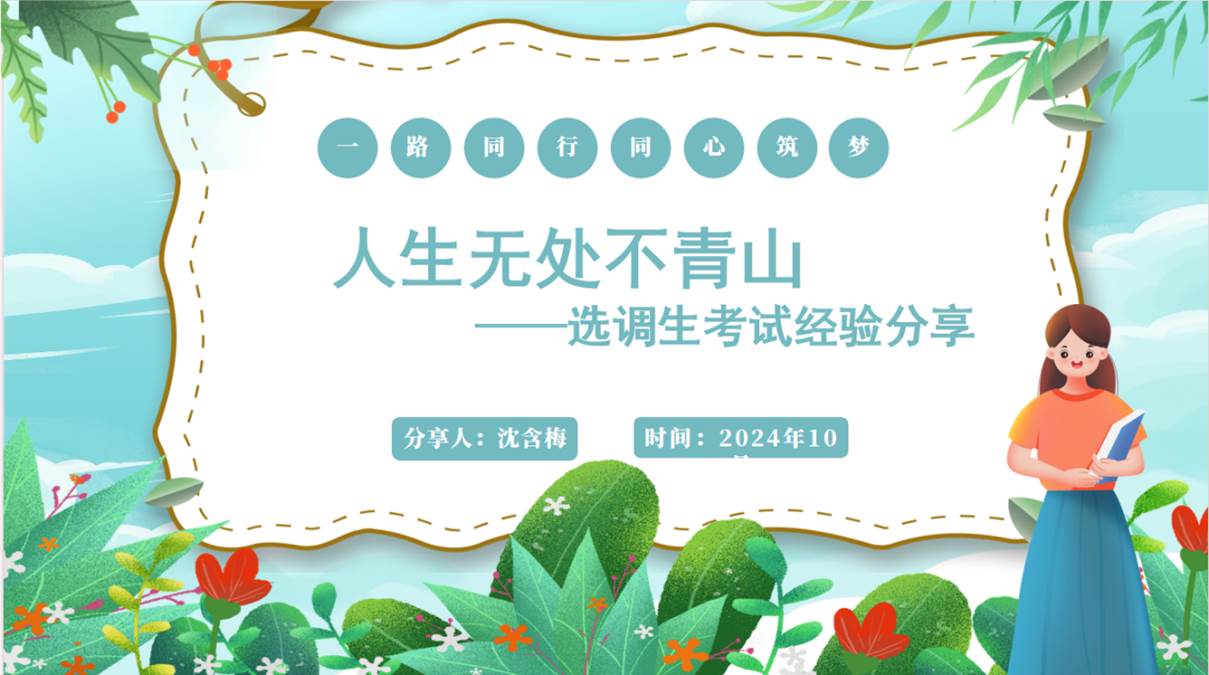 2020级本科毕业生沈含梅(浙江省选调生),以“人生无处不青山”为主题在线上进行选调生报考经验分享。她目前就职于浙江省绍兴市嵊州市委组织部。沈含梅从自己真实的心路历程出发,讲述了为什么选择就业道路,以及报考选调生需要注意的各类事项、所做的准备。
