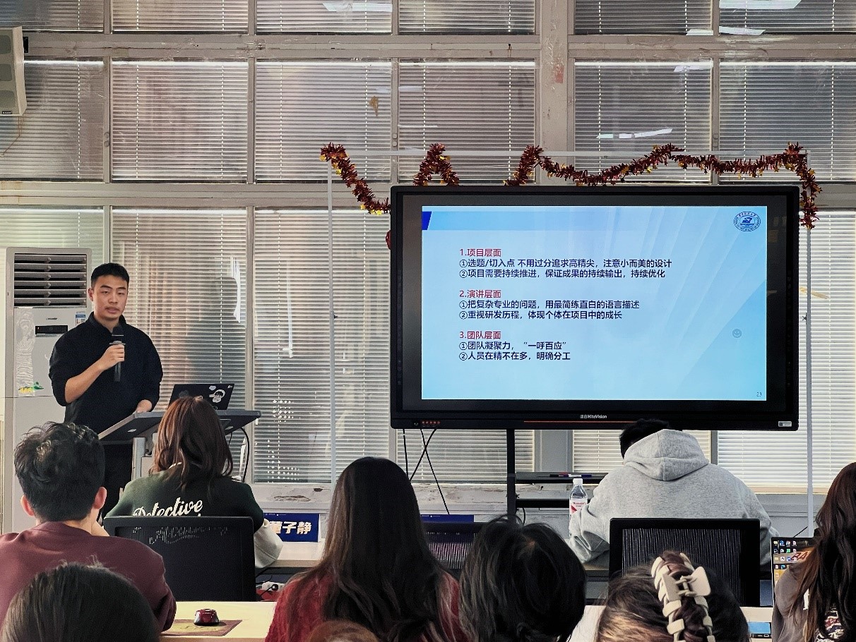 “青创+”朋辈辅导团讲师、“挑战杯”全国特等奖项目负责人、材料公司 2023 级博士研究生侯明君,创新性提出一要构建可视化故事线,用3D建模呈现技术原理;二要设计对比实验矩阵,用数据差异增强说服力;三要创设应用情景剧,让评委看见技术温度。从“如何讲好作品”出发,为同学们提供了丰富且全面的竞赛经验。