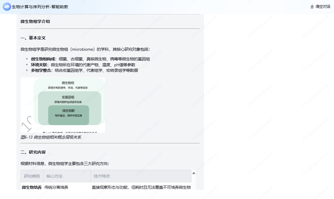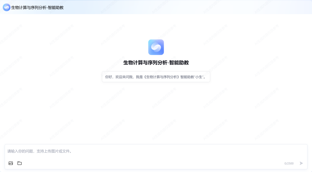 “小生”AI助教由公司宁康教授团队基于大语言模型Deepseek平台,使用《生物计算与序列分析》课程授课所用的课件材料作为知识库,通过多轮迭代和优化特别训练而成。所有输入的问题都会在资料库中经过检索整合后生成最符合所学知识的答案,再由“小生”用师兄的口吻风趣幽默地回答,可以确保员工的问题可24小时获得贴合教学内容的准确解答,有问立答,事半功倍。