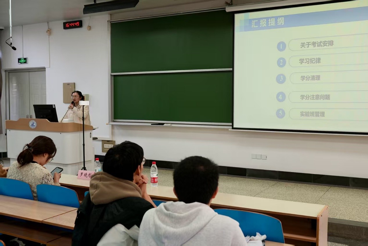 马业菲、聂丽娟分别就本学期教务工作安排和注意事项进行详细解读。马业菲重点梳理了选课安排、学分清理、培养计划及实验班管理规定,提醒同学们关注教务系统通知,避免因操作失误影响学业进度。聂丽娟则针对课程安排、学习纪律等进行说明,强调学术诚信的重要性。