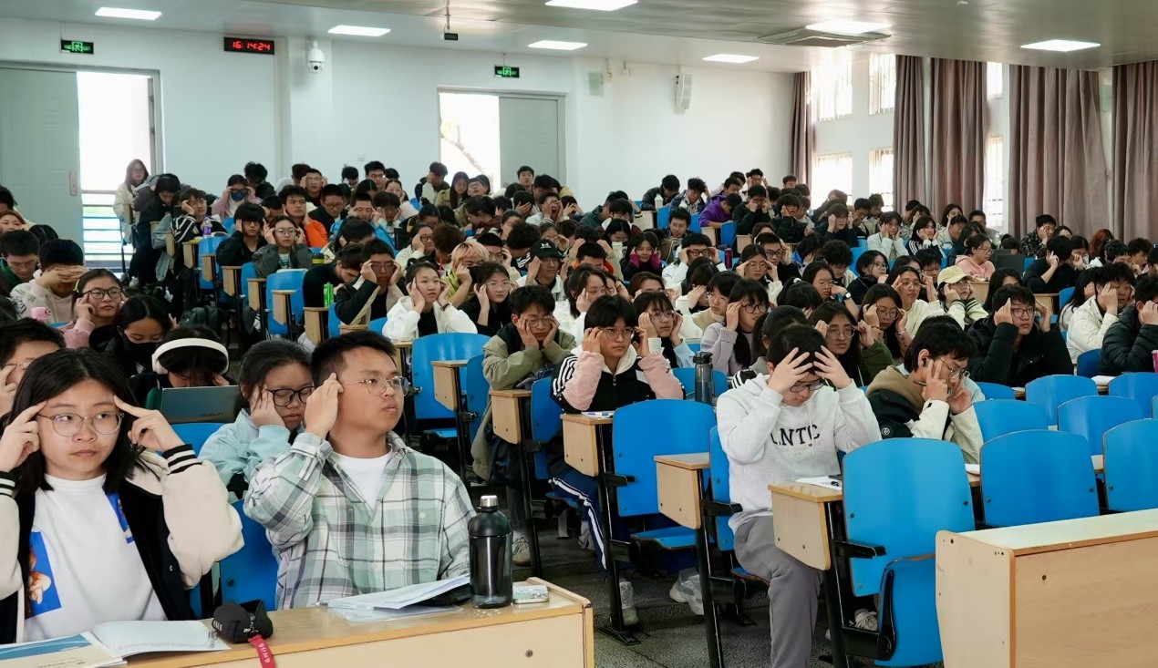 罗晓彤老师做《解码压力反应与实用应对策略》专题讲座。通过现场压力测试、专业知识讲授、情景模拟等环节,解析春季情绪调节方法,重点讲授“5分钟呼吸体验”缓解焦虑情绪、“20分钟公园效应”身体感官与体验连接、“舌尖冷静法”、运动训练“强化心理韧性”等实用心理技巧,并现场向全年级同学介绍校心理中心24小时咨询电话、预约咨询流程等。