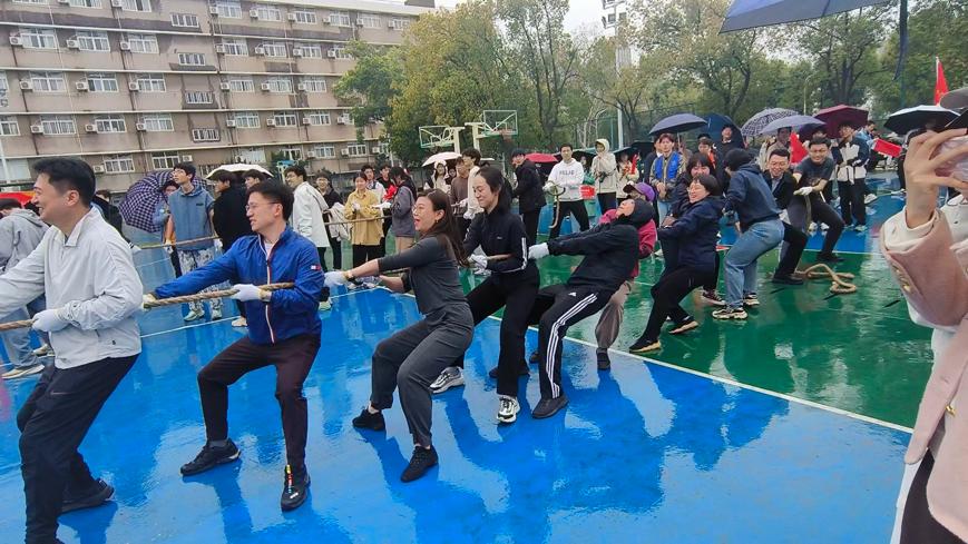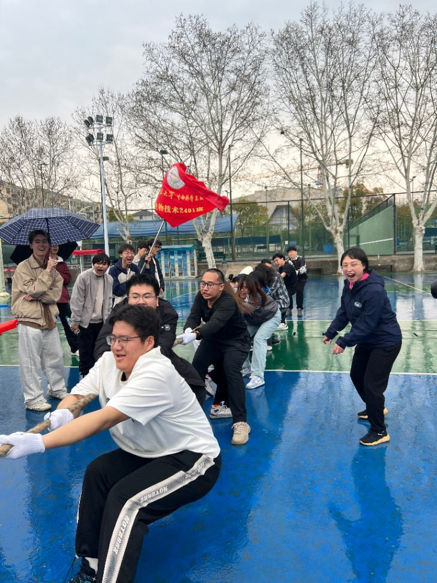尽管当天飘着蒙蒙细雨,但丝毫没有阻挡同学们的热情,生物技术2401班的队员们早早来到赛场,做好了充分的赛前准备,拍照打卡墙前,全班同学与教师班主任付春华老师一起将美好笑容定格。队员们激情满满,随着裁判一声哨响,比赛正式开始。队员们双手紧握粗壮的麻绳,身体向后倾斜,双脚牢牢扎在地上,使出浑身解数,相互鼓励、相互支持,心往一处想、劲往一处使,向着胜利的方向奋力拼搏。他们眼神坚定,脸上写满了坚毅和决心,每一次的呐喊都充满了力量和勇气,充分展现了团结协作的精神。教师班主任付春华老师也积极参与到了教师拔河比赛中,与同学们并肩作战。班主任的加入,不仅为比赛增添了更多的乐趣,也让同学们感受到了师生之间的深厚情谊。
