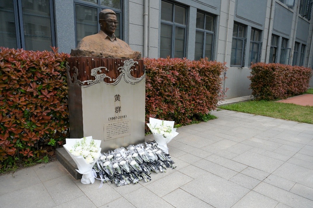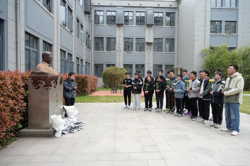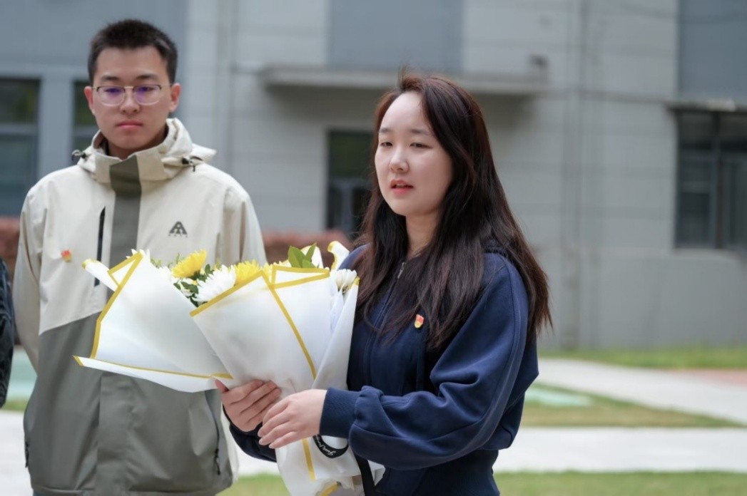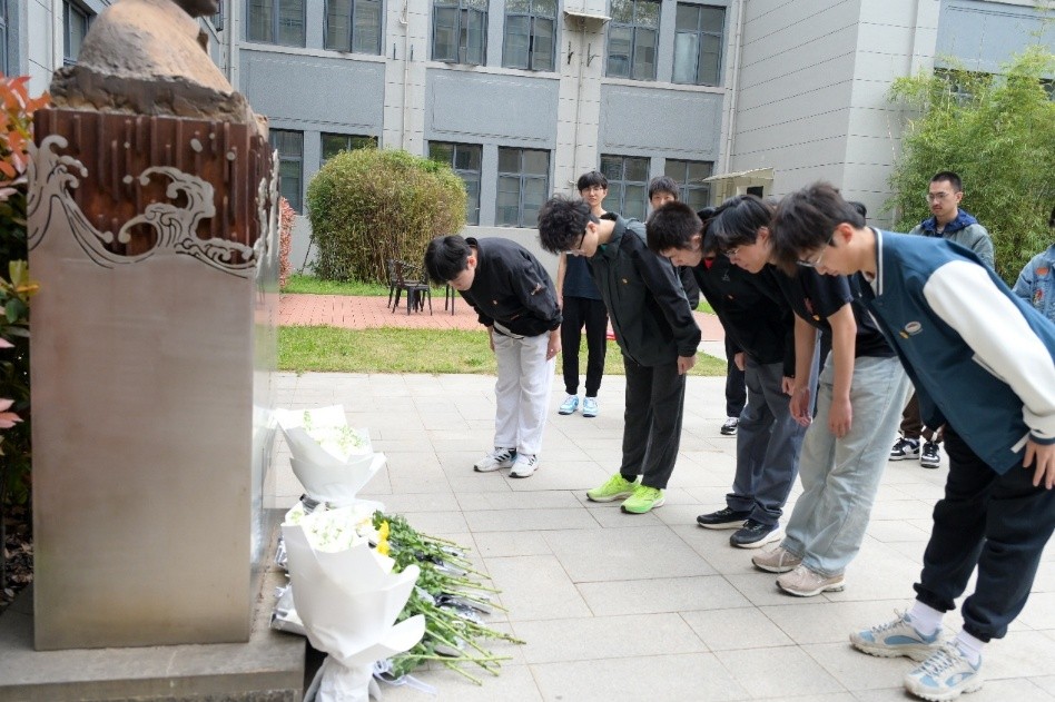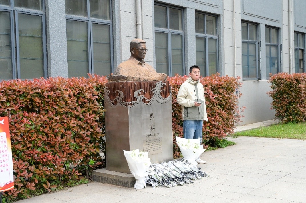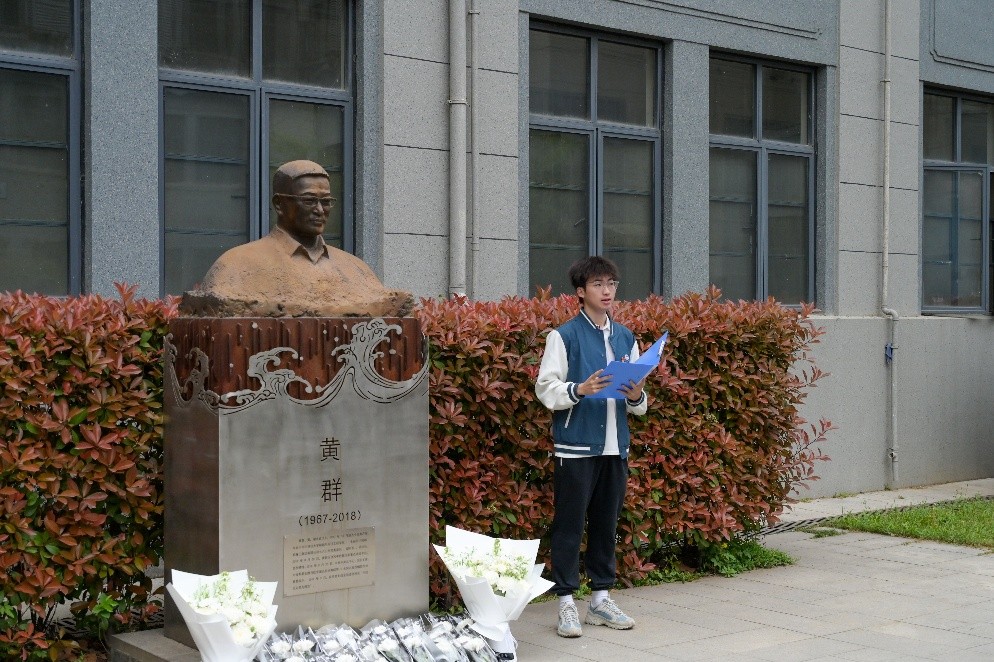 周钰对本次活动作出总结。她指出,黄群学长用生命守护的不仅是试验平台,更是共产党人“把一切献给党和人民”的价值追求。面对技术壁垒与民生需求,她勉励在场学子:“要像黄群那样,用专业所长守护万千生命。希望同学们将‘科研报国’四个字,真正书写在每一份实验数据、每一次调研中。”发言结束时,她带领全体师生向雕像献花并鞠躬,春日阳光洒在雕像肩头,金色党徽愈发熠熠生辉。