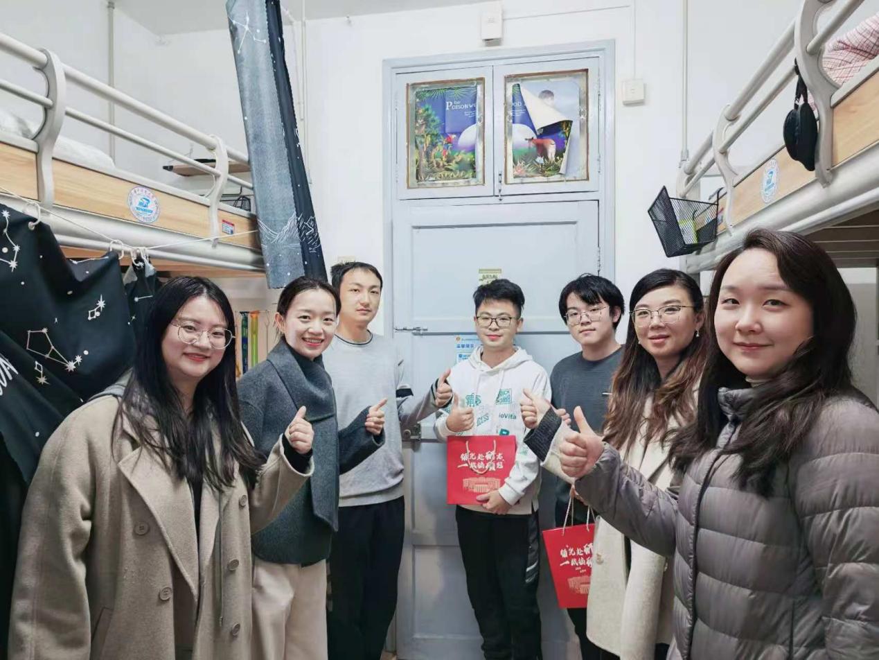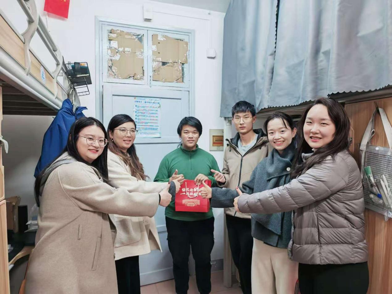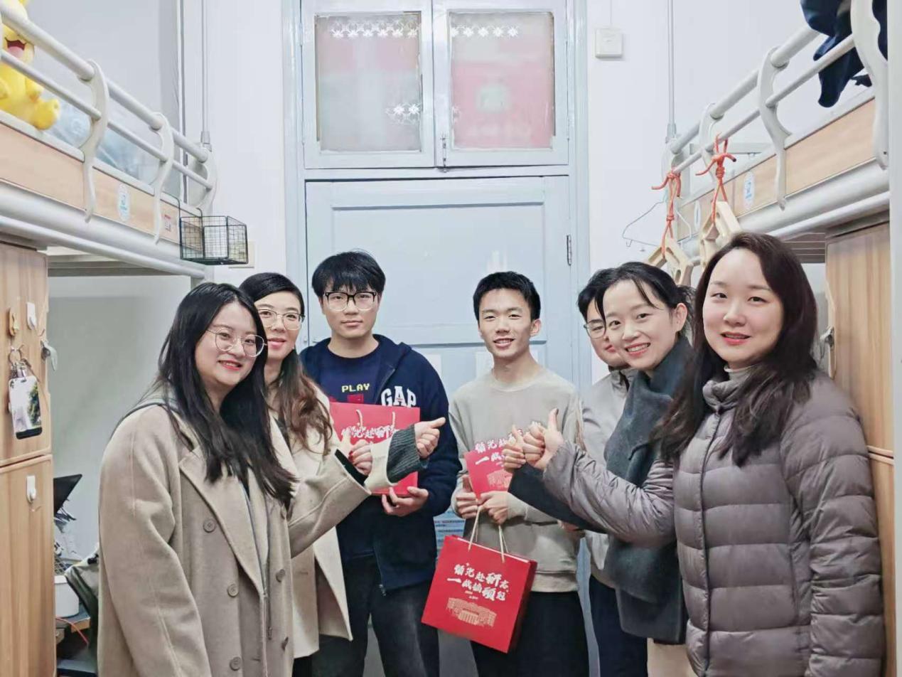 12月11日晚,公司党委副书记安娜、学工组长周钰、研工组长李若楠、22级年级辅导员蒋晗洁一同来到韵苑11栋、韵苑21栋宿舍,看望即将考研的同学们,并送上精心准备的祝福大礼包。