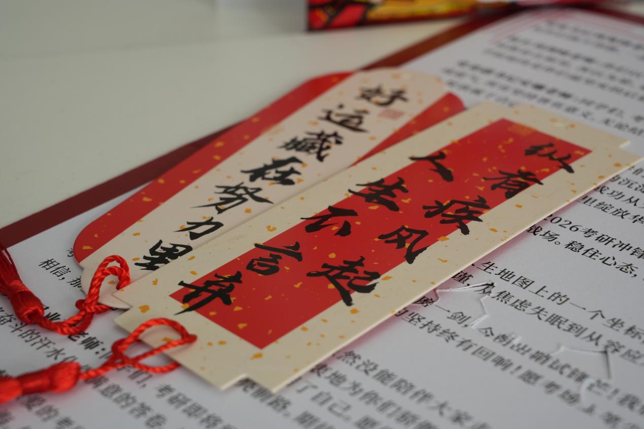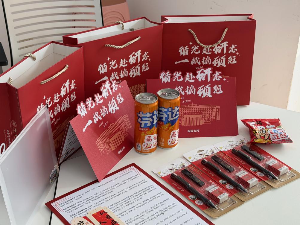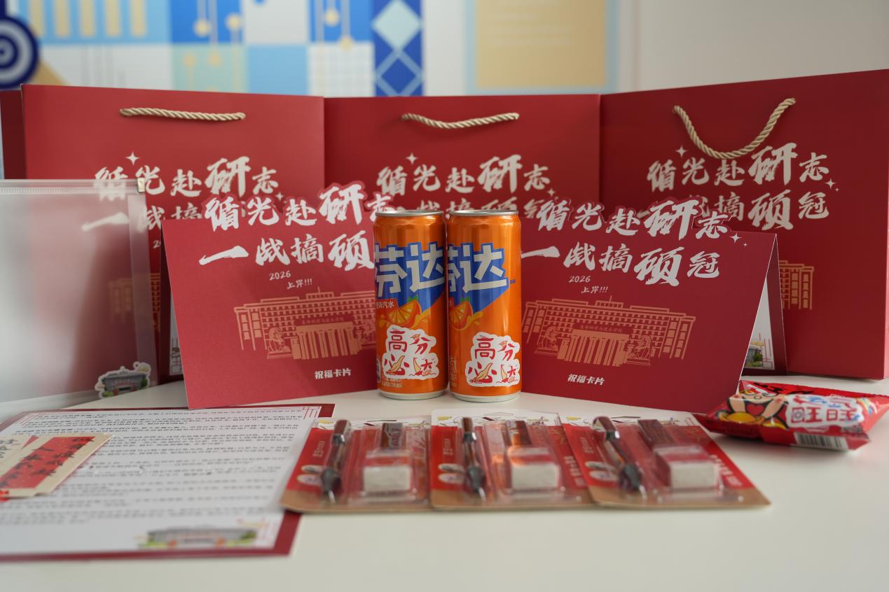礼包中包含祝福卡片、好运便签、涂卡笔、文具袋、定制纸袋、旺旺奶糖、芬达等精心准备的考试好物,为考研学子送上满满的祝福与鼓励。
