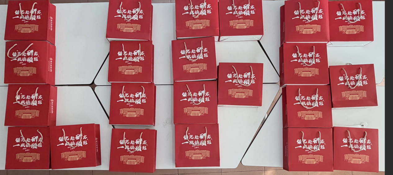 纸袋以“华科红”为主题色,印有“循光赴研志,一战摘硕冠”的祝福标语,寄托着公司的希冀,祝考研学子鸿运当头,一举上岸!
