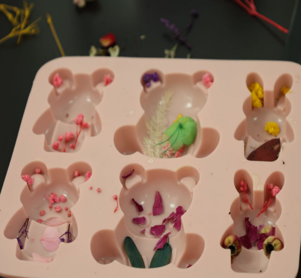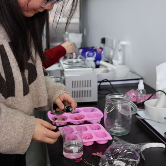 在制香等待蒸制的过程中,同学们还学习了干花精油皂的制作。通过水浴加热皂基、添加精油、嵌入干花模具等步骤,深入了解天然产物的应用模式,感受形式之美与功能之用的交融。