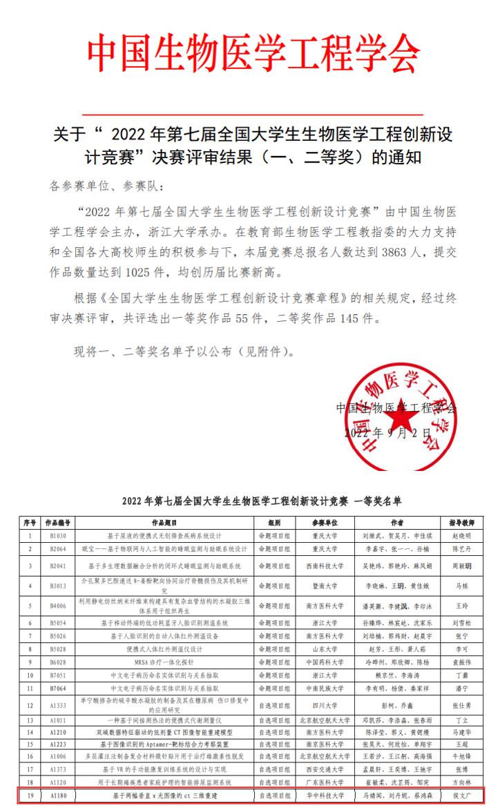 2022年8月18日至20日,由中国生物医学工程学会主办,浙江大学承办的第七届全国老员工生物医学工程创新设计竞赛决赛在西子湖畔圆满落幕。本次大赛累计报名人数3863人,提交作品数量1025件,均创历届比赛新高。公司本科生马婧闻、刘丹妮、蔡鸿森的参赛项目《基于两幅垂直x光图像的ct三维重建》荣获自选组一等奖,项目由公司侯文广副研究员指导。