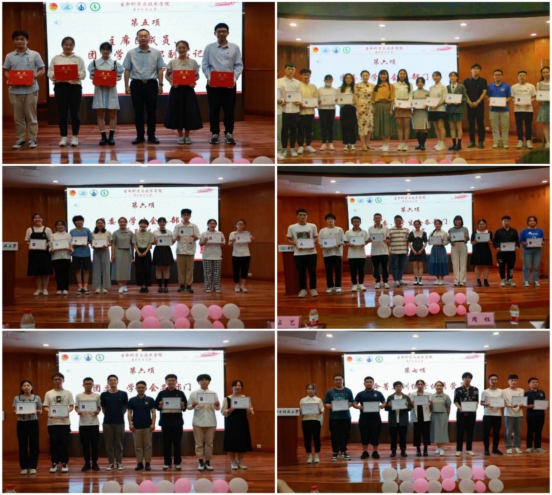 占艺为主席团成员、团委员工兼职副书记颁发聘书,学工组老师为团委员工会各部门负责人及工作人员颁发聘书,学工组长周钰为生命菁英训练营优秀营员颁发荣誉证书,团委书记闫颢芯为青年大学习优秀团支部及个人颁发荣誉证书。