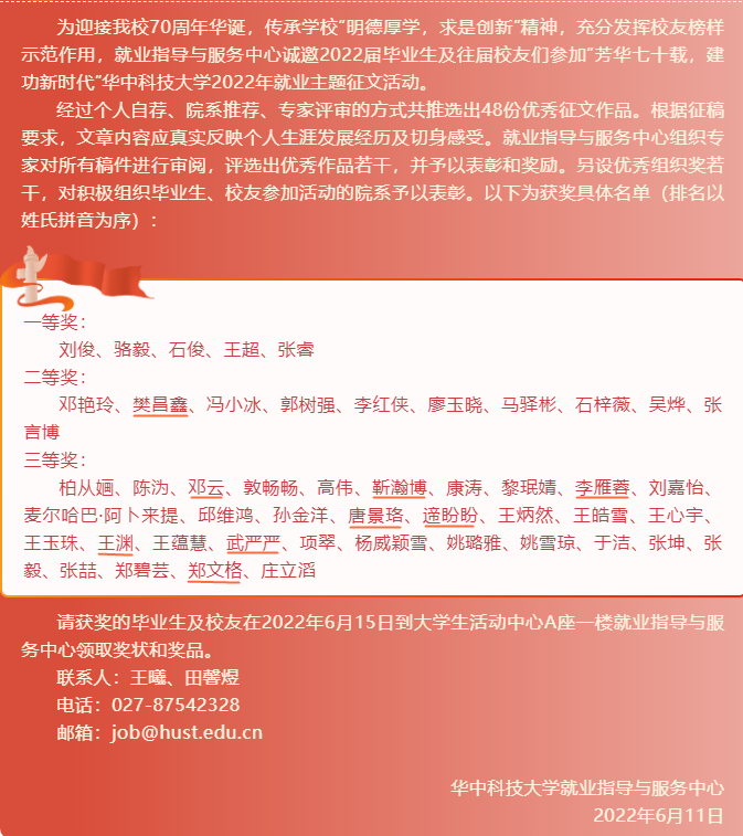 为迎接公司70周年华诞,传承公司“明德厚学,求是创新”精神,充分发挥员工榜样示范作用,就业指导与服务中心举办“芳华七十载,建功新时代”2022年就业主题征文活动,经过个人自荐、院系推荐、专家评审,公司共有9名毕业生获奖,其中二等奖1名、三等奖8名。