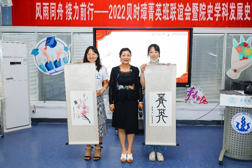 员工互动环节,21级同学展示了他们入校1年学习生活微视频,18级廖康同学分享了班级在大二期间获得胡吉伟班荣誉的经验,她在PPT中展示出18级贝班的优秀成绩与开展的各项活动。自由交流环节,21级贝班同学们积极向学长学姐提出关于班级建设、学风建设、团会举办、科研、实验等方面的问题。18级同学与老师们也积极的给出了自己的观点与建议。贝班同学们的谢妈妈为即将毕业的大四同学们送上了美好的祝福。她同时准备了两张自己的画作与书法作品作为幸运同学的毕业特别礼物,李镀锋为每一位同学准备奖品。