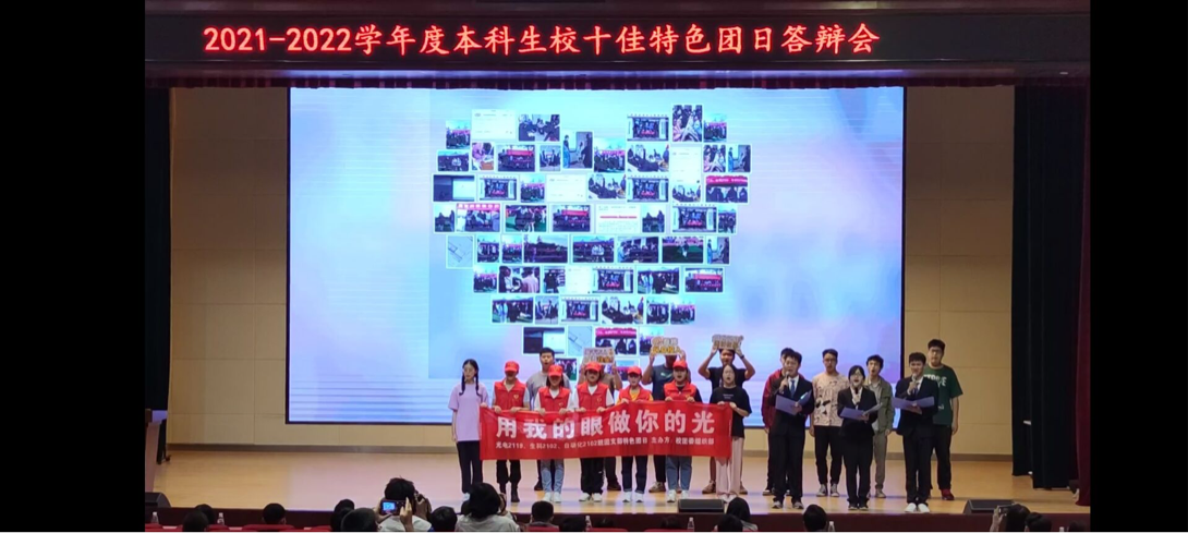 因爱集结,为爱发光,生科2102团支部组成的发光小分队怀揣着炙热的心,开启一段不平凡的旅程。“用我的眼,做你的光”,他们成立公众号宣传助盲知识,路演当天带领参与者体验盲人生活,拜访失明群体,做好志愿服务。发光小分队将电影《长津湖》由银幕书写到白字黑字间,同他们一齐感受英雄儿女的爱国热血。箴言如炬:我自不辱使命,使我与众生相聚,他们传递爱与温暖的脚步永不停息,报青春之国,共计700小时的志愿时长是他们作为华中大学子的担当与责任!在答辩舞台上,演讲者掷地有声,如滔滔春水诉说着对失明群体的关怀;舞台剧贴切真实,反映出他们为盲人付出的真心热忱。最后,在“你是我的眼”的歌声中,全体成员发出真挚的呐喊,“虽千万人,吾往矣”的豪迈回荡在宽广的报告厅中。在未来,他们还将继续努力成为发光的人。羡子年少正得路,有如扶桑初日升,肩鸿任钜踏歌行,功不唐捐玉汝成。盛世已启,责任在肩,助盲的使命,会一直同他们走向光明的远方。
