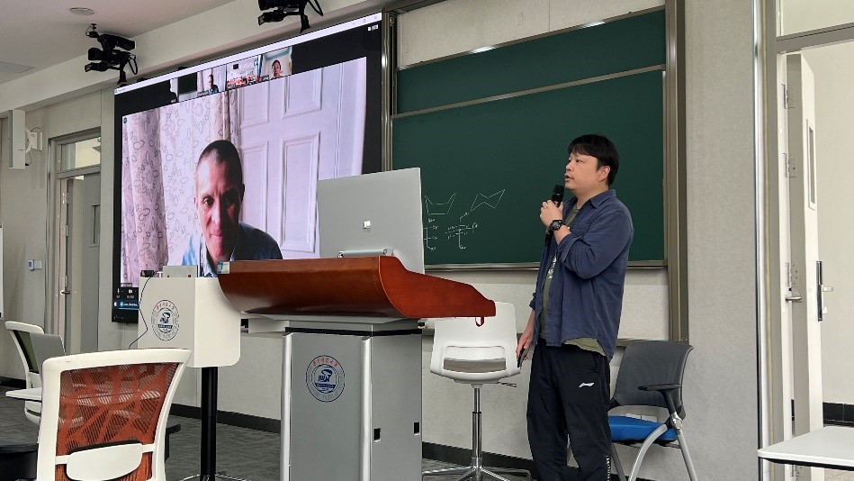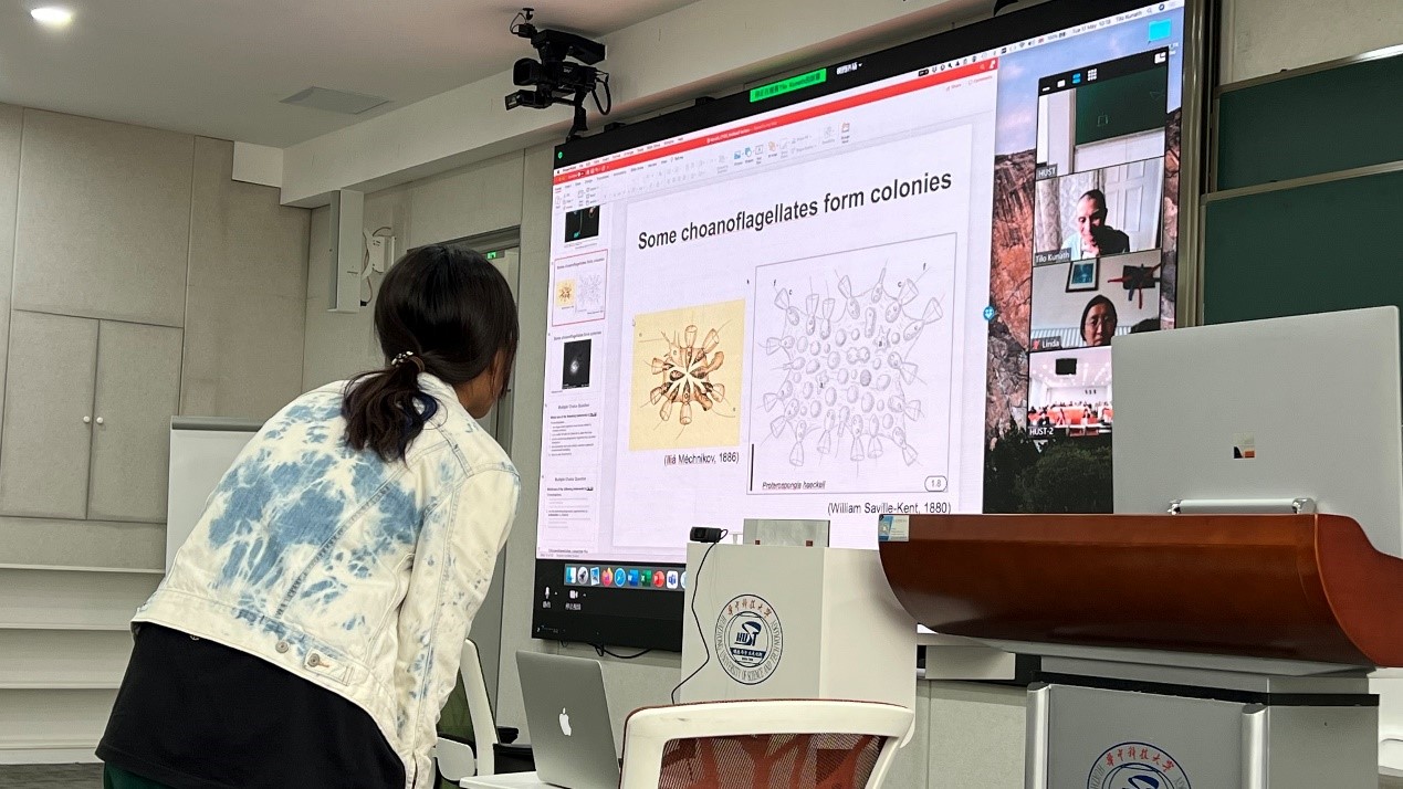Kunath教授以视频和图片结合的形式,生动讲述了多细胞生物的定义和进化,并着重讲解了现存单细胞动物中最接近后生动物的领鞭虫类,激起了同学们的探索热情。在交流环节,同学们对讲座内容踊跃提问,Kunath教授给予耐心解答。两位青年教师也参与多细胞生物相关学术探讨,课堂氛围十分热烈。