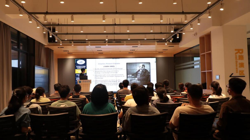 朱斌教授带领同学们追溯生物学和分子生物学的历史发展,并提出了自己的科研见解:随着新技术的出现,当下微生物核酸酶的发现是一片前景广阔的“蓝海”。朱斌教授用当年洪堡、达尔文在新大陆的重大生物学发现,和当下分子生物学领域潜藏的机遇类比,鼓励同学们在国际竞争中开辟赛道、发挥自己的优势。此外,朱斌教授还分享了自己在哈佛的博士后生涯,展示了自己和团队的研究成果。他生动幽默地讲述了自己将热爱发展为事业的心路历程,并给想要从事科研工作、申请国外博士的同学们提供了各种实用的建议和指导。