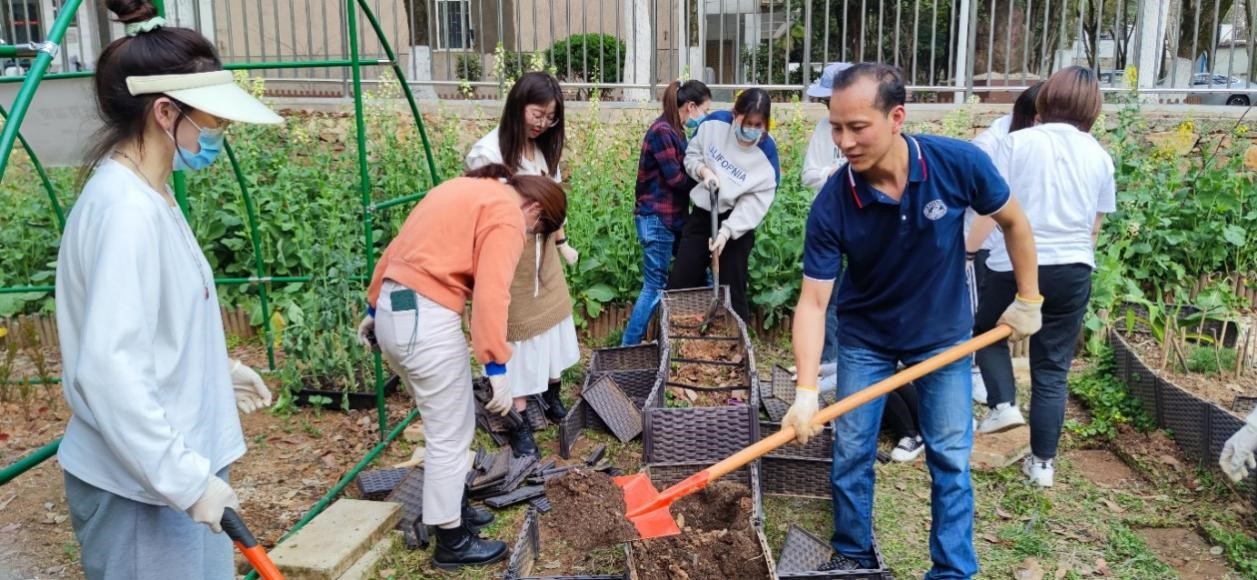 在金文闻老师的指导下,全体党员同志有序分组,有的小组负责将公司楼顶废弃已久的旧土搬运到小农园,用购买的营养土进行土壤营养更新;有的小组负责对小农园的花圃围栏进行拆除,将干结了一个冬天的土壤翻新、除草,并重新组装围栏,给重新装入的土壤施肥、浇水;有的同志将支部采购的瓜果秧苗进行育苗、组装爬藤架等。大家分工明确,配合默契,干的热火朝天,任务进行的井然有序。