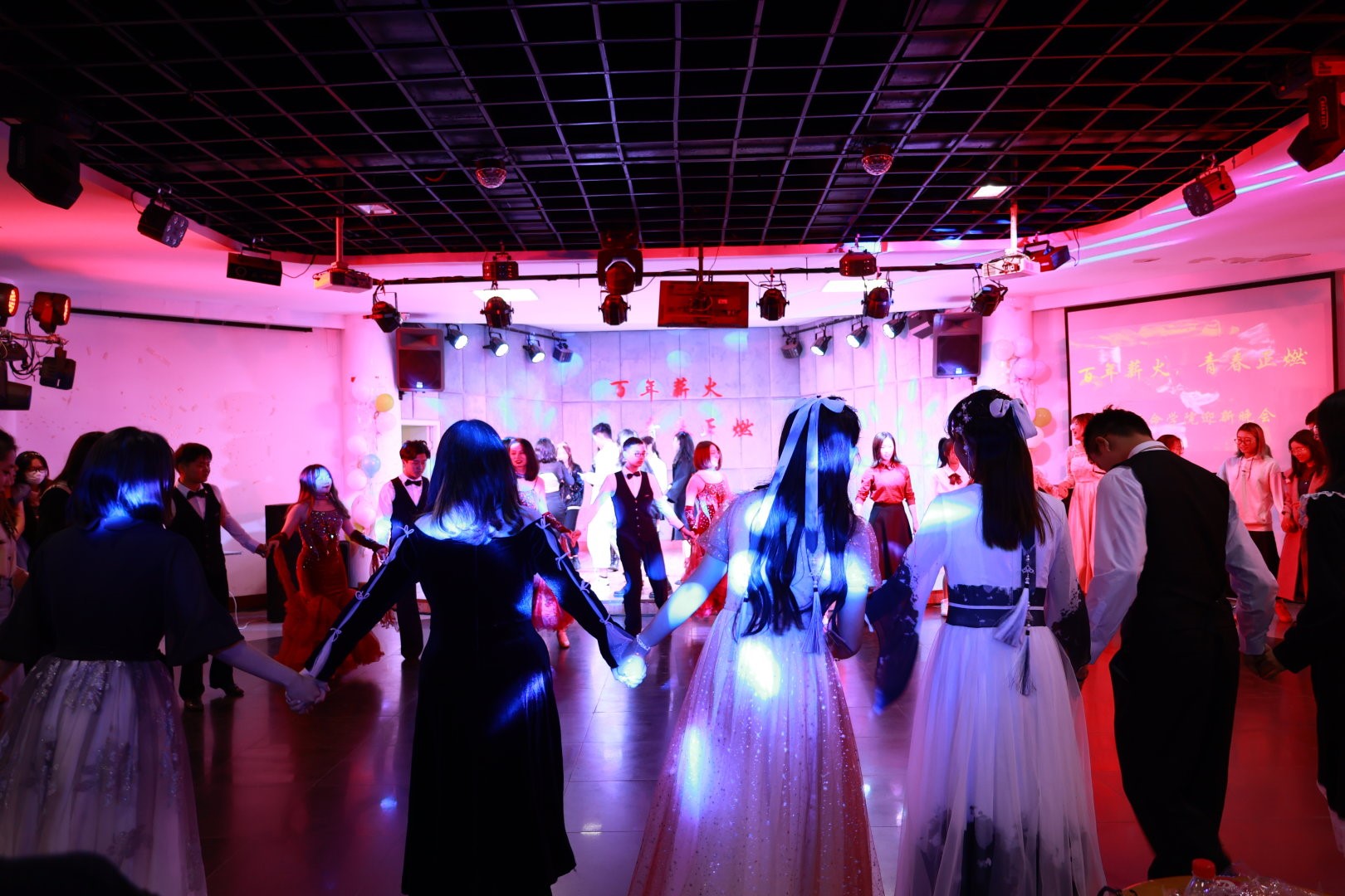 十余个精彩的节目结束后,开始的是本次迎新晚会的舞会环节。交谊舞协会的嘉宾率先走入舞池为现场观众献上了一段惊艳的交谊舞表演。接着,伴随着或欢快或舒缓的舞曲,现场的观众嘉宾与工作人员纷纷步入舞池,踩在集体舞的节拍上感受律动的酣畅;随着双人舞的旋律体会舞步的曼妙。舞会终了,由本次迎新晚会工作人员带领现场观众合唱的《我和我的祖国》将迎新晚会的气氛引向高潮。生在国旗下,长在春风里。五星闪烁,皆为信仰。所有师生的合唱,将最真挚的祝福献给祖国和党。
